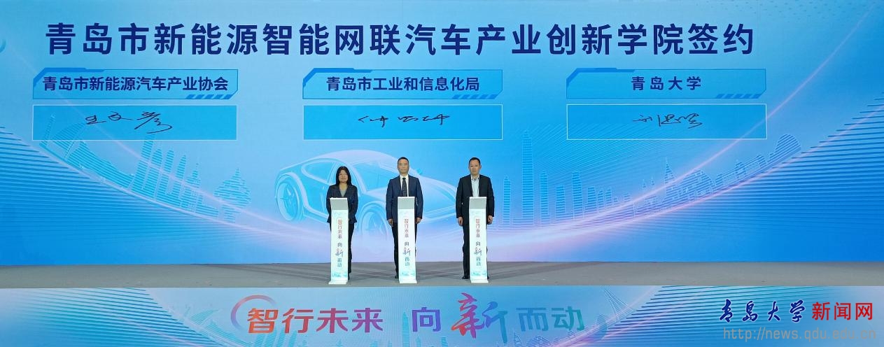 活動中,我校與青島市工業和信息化局、青島市新能源汽車產業協會簽約共建青島市新能源智能網聯汽車產業創新學院。創新學院旨在建立新型信息、人才、技術、資源共享機制,協同推動青島市新能源汽車產業發展。