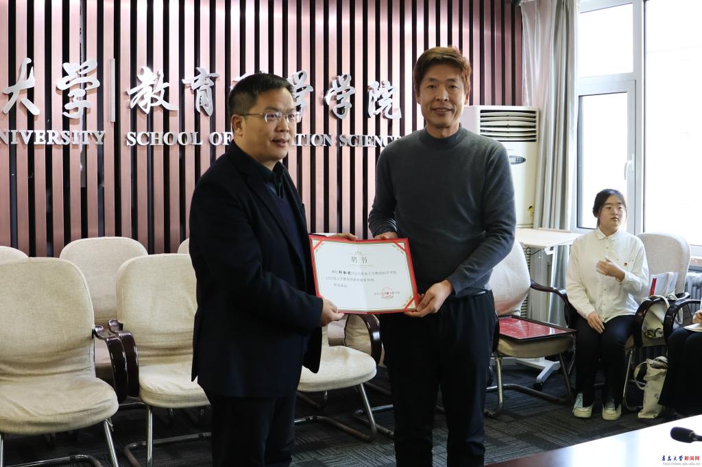 會(huì)上,教育科學(xué)學(xué)院院長(zhǎng)孫百才為胡欽曉頒發(fā)“德育導(dǎo)師”聘書。