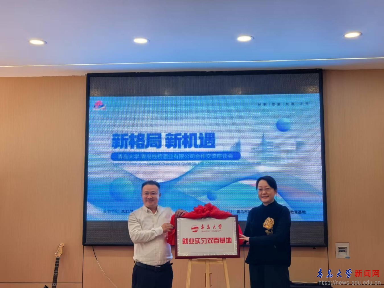 學(xué)生工作處處長王春與劉鳳昆共同為青島大學(xué)就業(yè)實習(xí)雙百基地揭牌。
